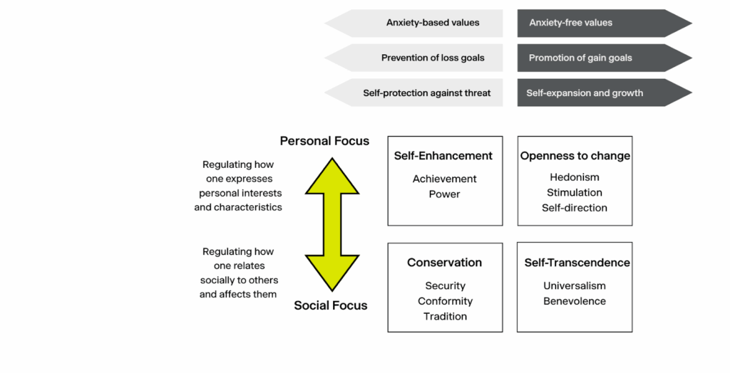 Each of these values represents a distinct motivational goal. No single value exists in isolation; together, they form a continuous wheel, each segment influencing and opposing the others.